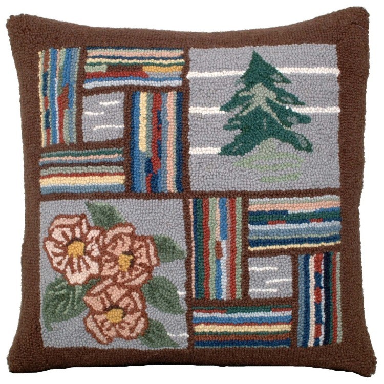 Early rug hookers would take ideas from what they saw around them. On the coast of Maine, you would see a sail boat at sea, a simple log cabin with smoke coming from its chimney, a pine tree, etc. The alternating square boxes between the pine tree and flowers are basic "hit or miss patterns". The early rug hookers realized that they could use scraps of material (even old clothing!) to fill these spaces.