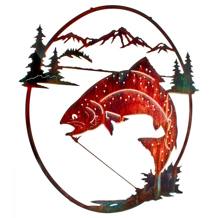 This item has sold out and is no longer available Click here to see other Metal Wall ArtThis High Lake Rainbow Metal Wall Art is laser cut metal that features a rainbow trout that has just been hook has he traveled down a mountain stream. It is designed by wildlife artist Neil Rose and each piece is created individually so no two will be alike.