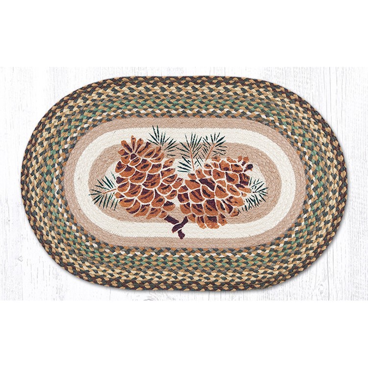 This item has sold out and is no longer available Click here to see other Braided Jute RugsThis Large Pinecone Rug features a rustic yet elegant central pine cone design. Our pine cone jute rug which is made from 100% jute fiber is naturally water repellent, color fast and fire retardant. It can be cleaned with just soap and water. The wide braided border colors include green, charcoal, beige, tan and brown. This rug can be used in the bath, kitchen or even by the fire place to lend a rustic touch to your home.