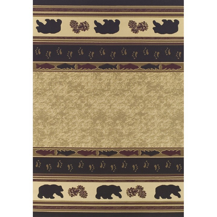 Pahaska Bear area rug has a double border design that works well in areas were you view the rug from 2 different angles. Fish, bear tracks and bears with pine cones will complement most rustic theme homes. The soft hand of a plush 10mm high pile height will insure you years of comfort. It is made of heat set Polypropylene that is colorfast and stain resistant. Colors include brown, beige, and tan. Ships in approx. 3-5 days.