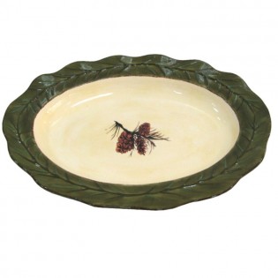 This hand-painted pine cone platter features pine cone sprigs on a neutral color background with a band of dark green. This rustic serving platter is dishwasher and microwave safe.