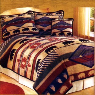 This rustic Yuma Bear Fleece Bed Set - Queen set features a dramatic southwest design in beige, burgundy and blue with black bear silhouettes. Made from 100% recycled fibers this rustic bedding is earth friendly and can be machine washed.